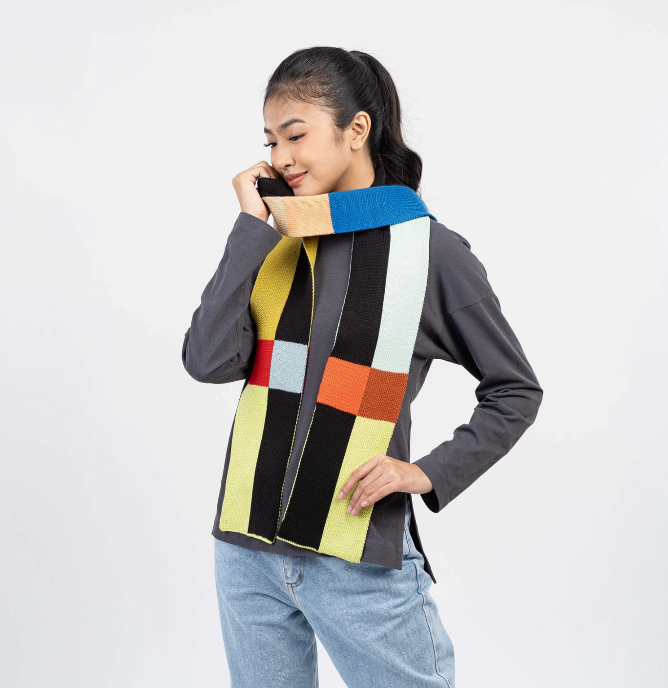 A vintage-inspired long skinny scarf knitted with bold colorblocking. Colorful, reversible, and unisex. For indoor and outdoor wear. Can be tied and wrapped in many different ways depending on weather or mood.