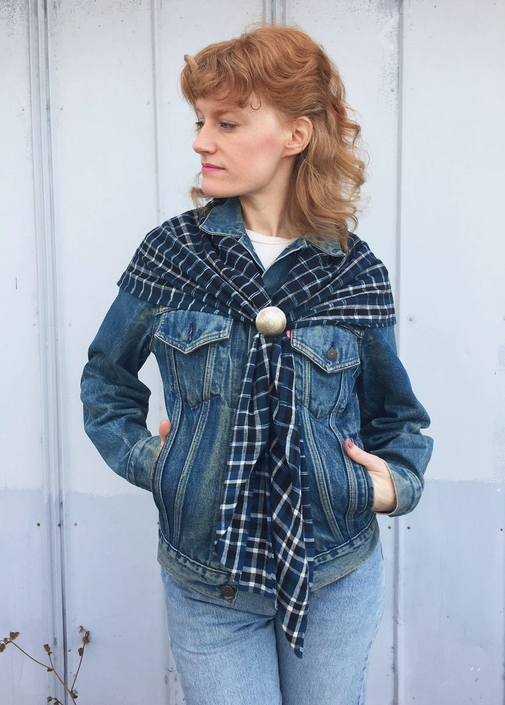 Handwoven cowboy scarf "Bodie" is made up of a tie-dyed grid of blacks and blues. Bodie was designed to be a classic scarf that goes with everything - like your favorite jeans or black leather jacket. Woven with khadi (handspun) cotton, this weave is gauzy and oversized for a cozy and breathable accessory for all seasons.