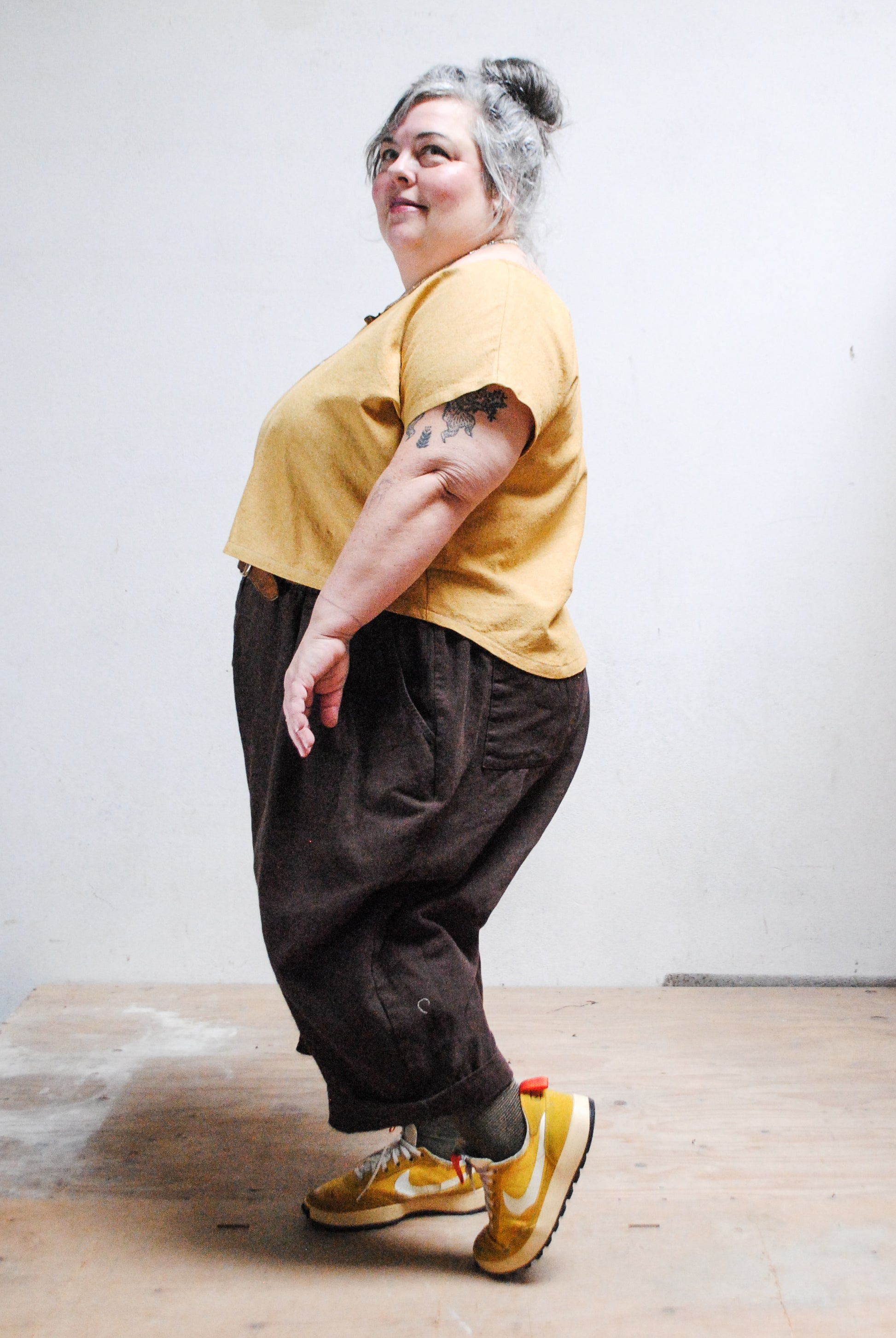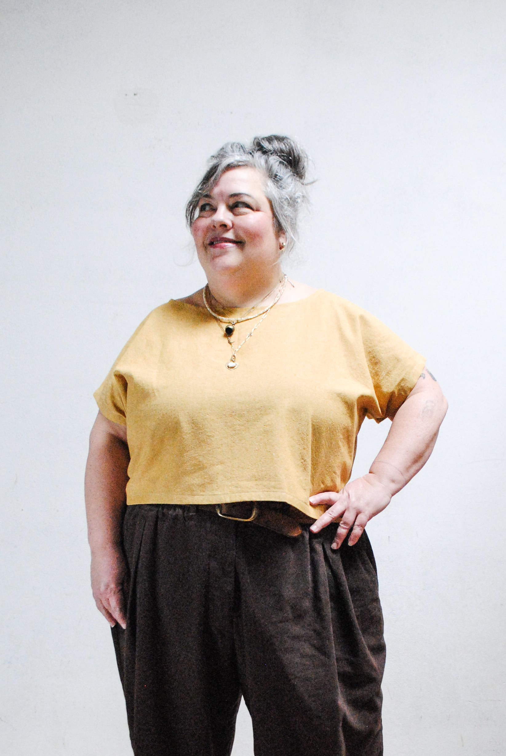 This adorable simple tee is cropped and cut straight across in the front, and curved and longer in the back. Cut-on cap sleeves add to the casual chic vibes of this versatile piece.