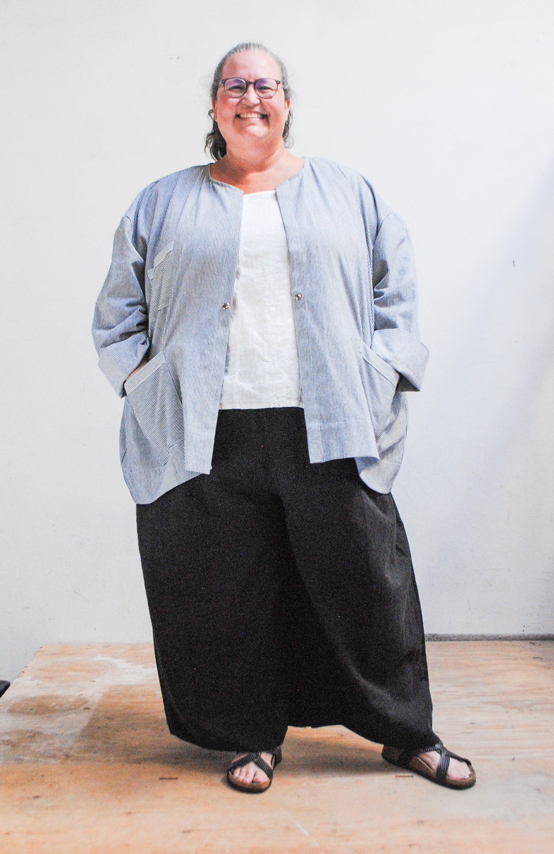 I am in *love* with this lab coat. Living in a hot humid climate has made it challenge to find a transitional topper. Not only is the lab coat functional, it is also pretty. It is really well made. The sleeves and all pockets have the cuffed design that is sewn in place with the stripes lining up and it really gives the coat a design touch versus a mere functional coat. The cropped sleeves do not get in the way when I’m working in my studio, which is fantastic. The big pockets easily hold my phone or I can slip my hands in there when I’m out and about. The cut is so flattering too. I purchased the smallish. I am 5’2” and wear 14-1x depending on designer and cut. I hope they release another lab coat in another print in this weight. Really cannot stress how pretty and functional this piece is.