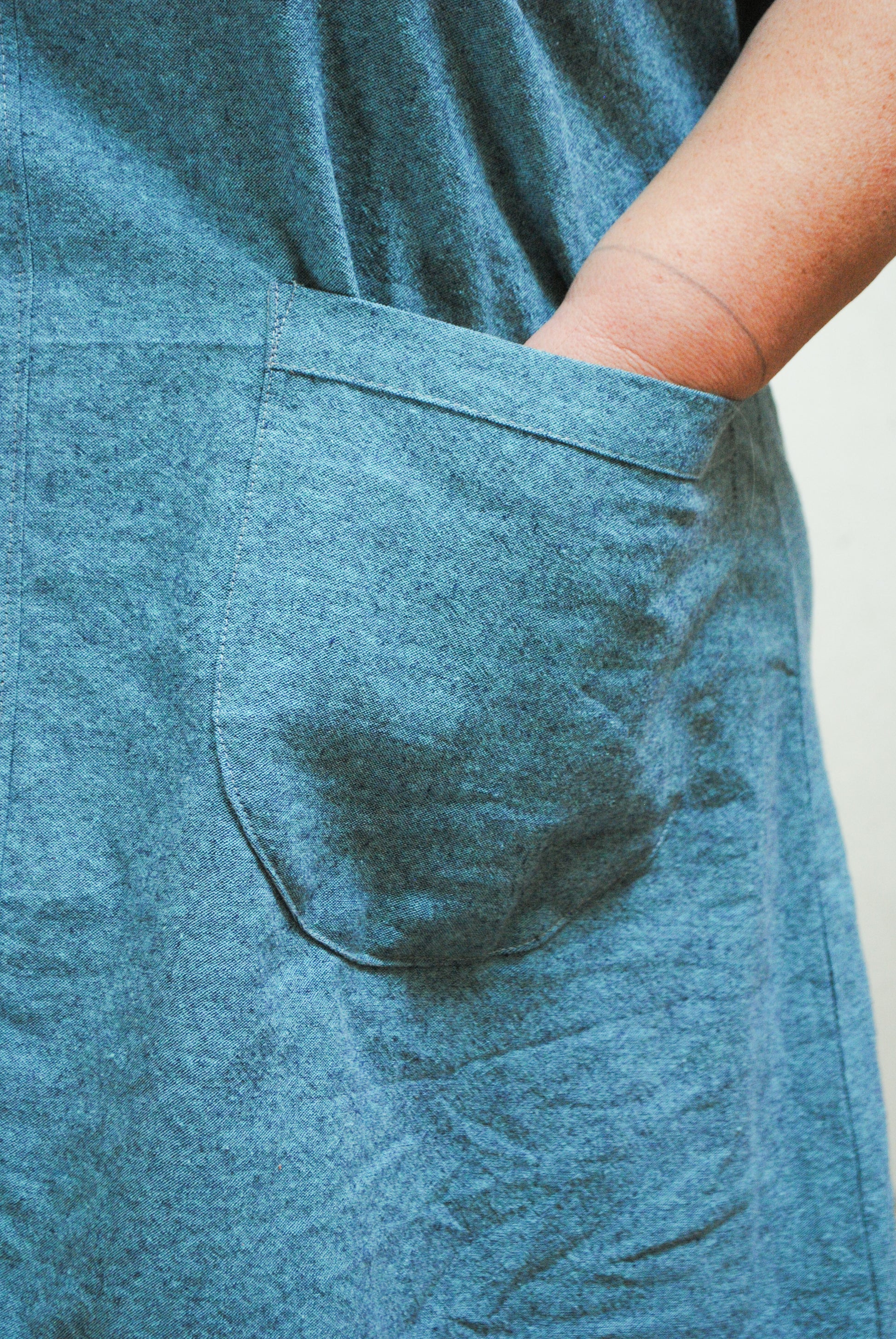 At around 5" shorter than the usual Basic Dress, she's a little more knee-adjacent than usual, and has rounded pockets! CUTE! Just in time for spring.