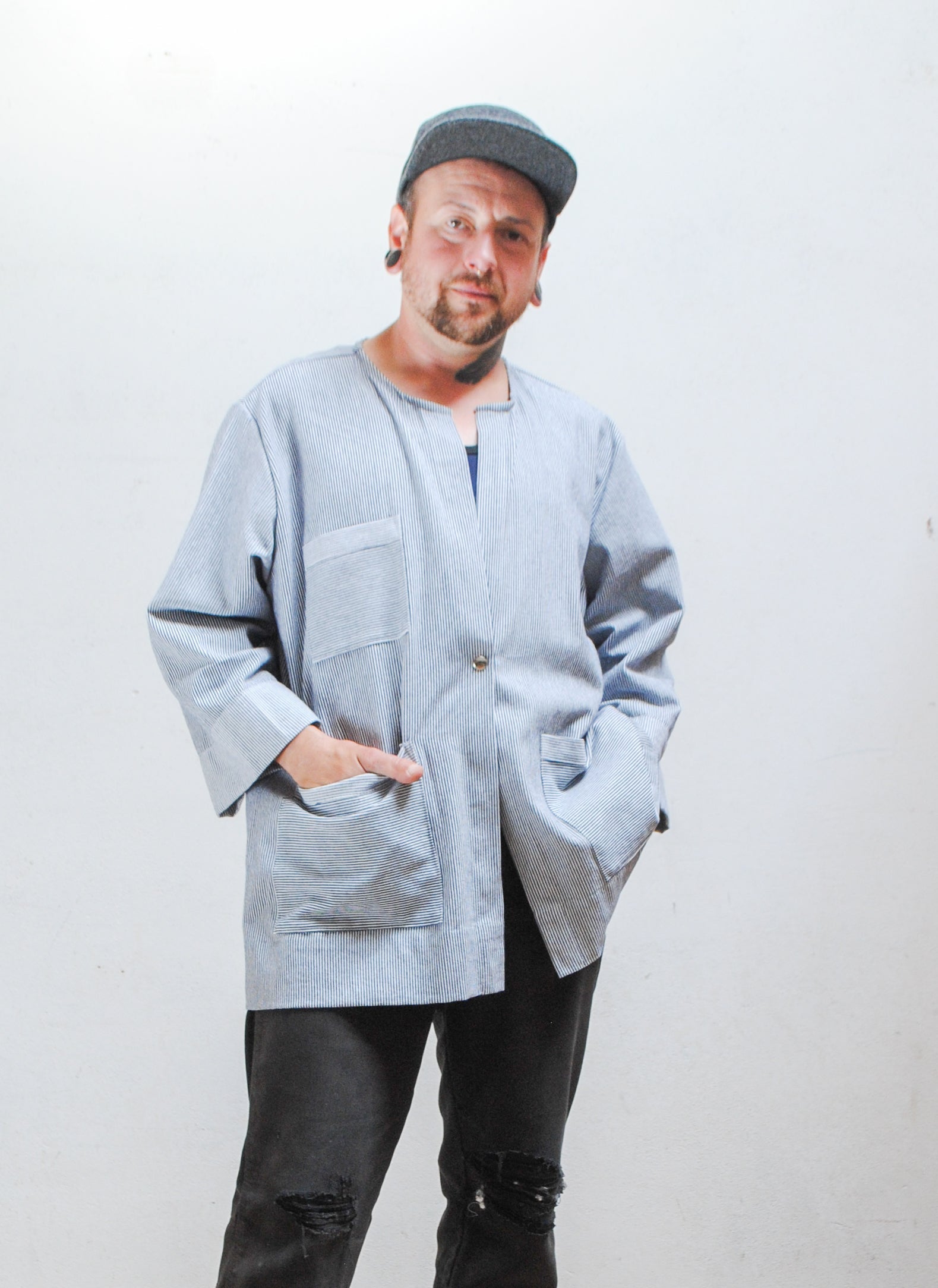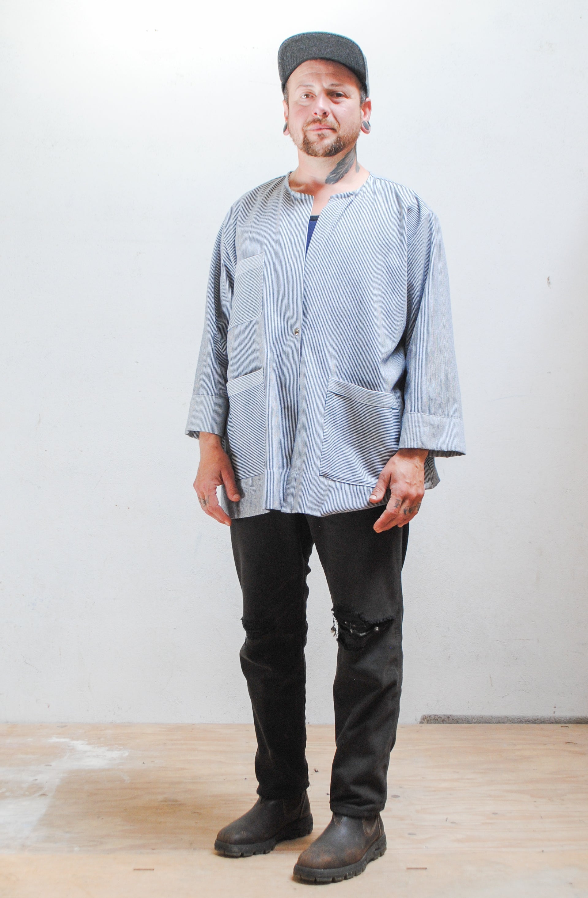 Inspired by hickory shirts, chore coats, and those cute French work coats Bill Cunningham wore to take fashion pics in the streets of New York City, the Shift Lab Coat is made from super soft 8oz 100% cotton railroad stripe denim, and cut to fit loosely if you want, or closer if you prefer. The sleeves are ever so slightly cropped to facilitate working and feature a very deep hem for a nice weight. Loose a-line shape accommodates hips and bellies. Single snap keeps you together.