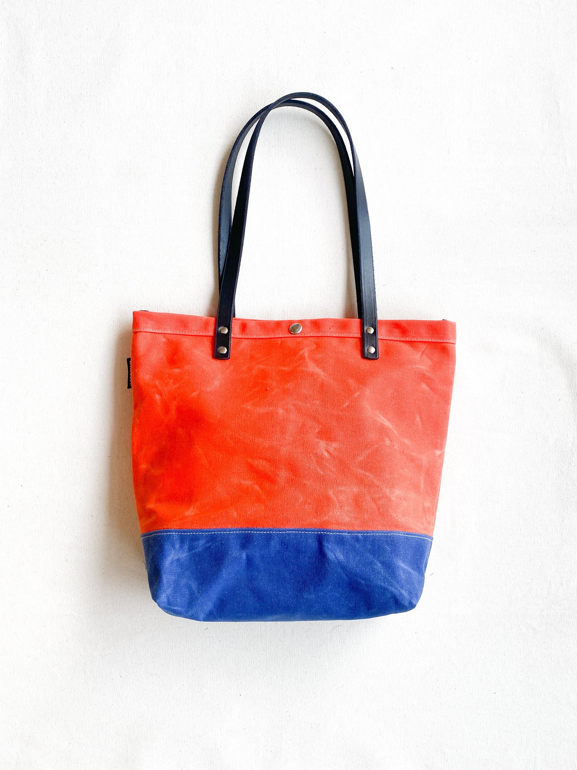 Everyday tote with handles long enough to throw over your shoulder or hold at arms length. Two pockets on body side. Waxed canvas with bridle leather handles. Approximately 15"x14"x4". 10” Strap drop. Bottom inside panel of bag is made with striped railroad denim.