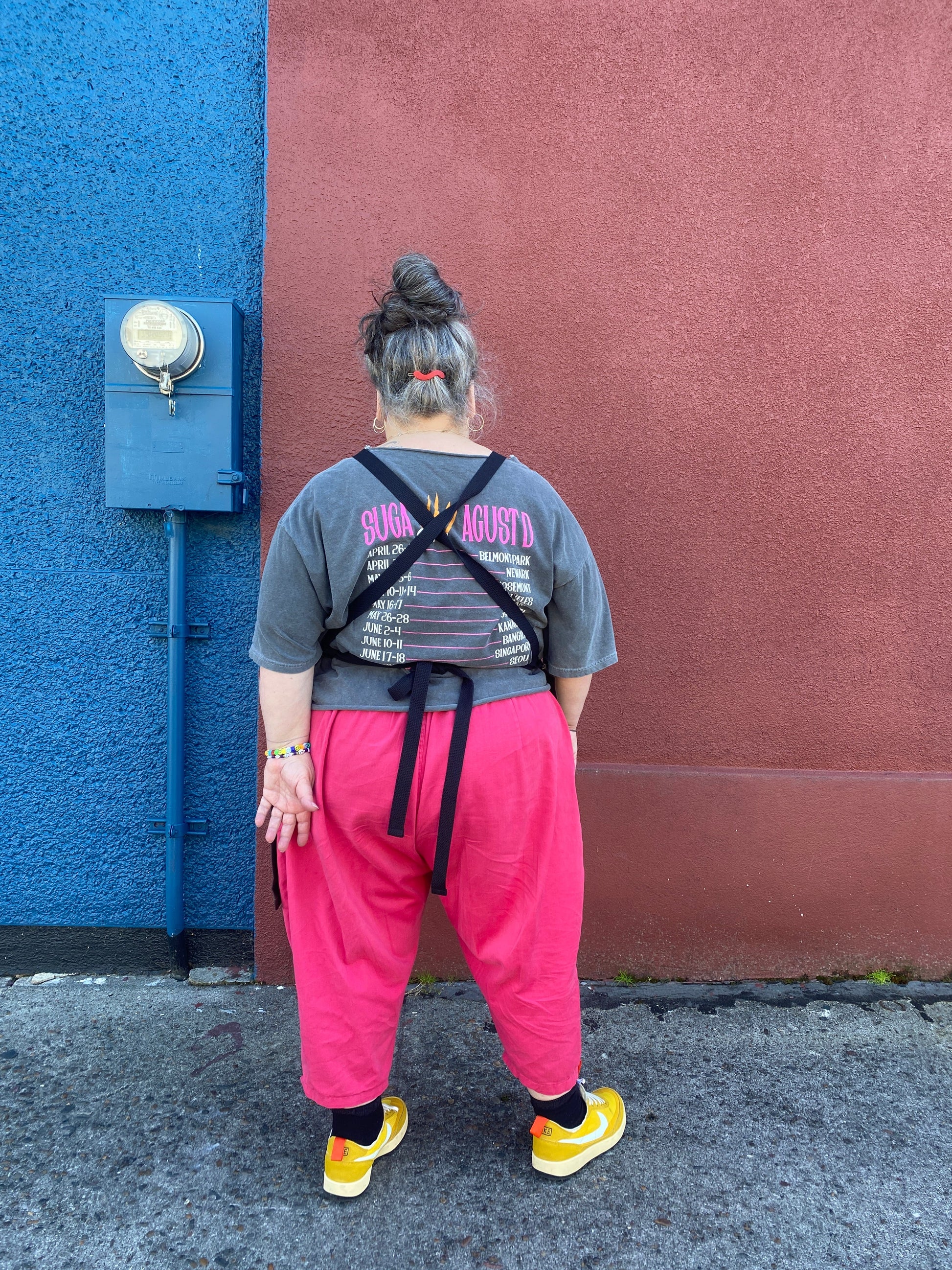 Pony in the grey apron is wearing a Medium, Nick (burgundy) is wearing the Medium and Becky (brpwn) is wearing the Large.