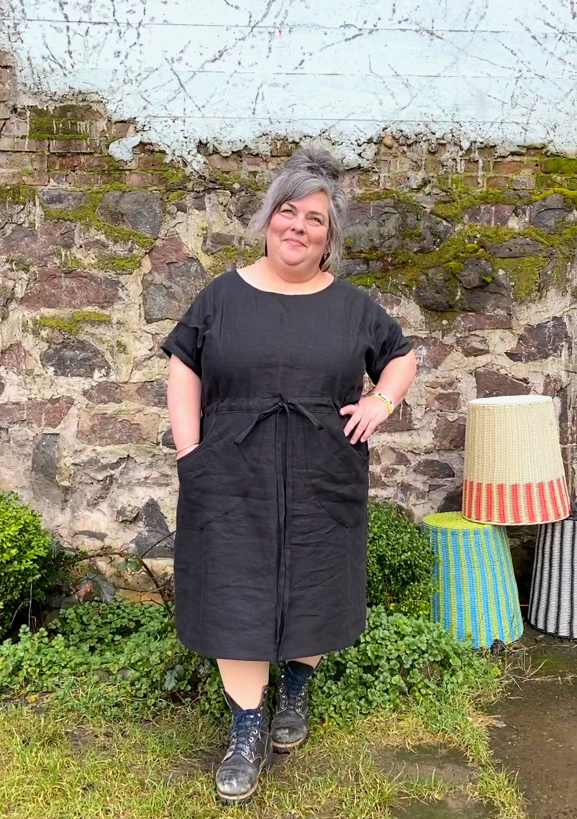 OK! THIS DRESS HAS BIG POCKETS. It also has a fairly wide neckline, blousy fit bodice, drawstring waist, a-line skirt, and a hem that hits around the knee depending on how tall you are. Curves a wee bit longer on the back lower hem. Shorter dolman-ish sleeves make layering over and under easy. Made of our favorite medium weight 100% black linen, prewashed. Great for all seasons.