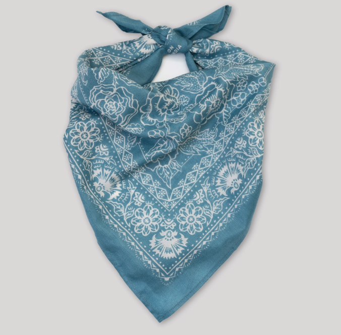 One of our best-selling patterns in a pretty blue colorway! Faded blue is the color of a dusty chambray shirt or perfectly aged denim. Rosey-Danna's wild rose pattern inspired by Art Deco illustrator George Barbier, 18th century French textiles. A detailed border pays tribute to Indian woodblock printing. Yep! This one is a real trip.