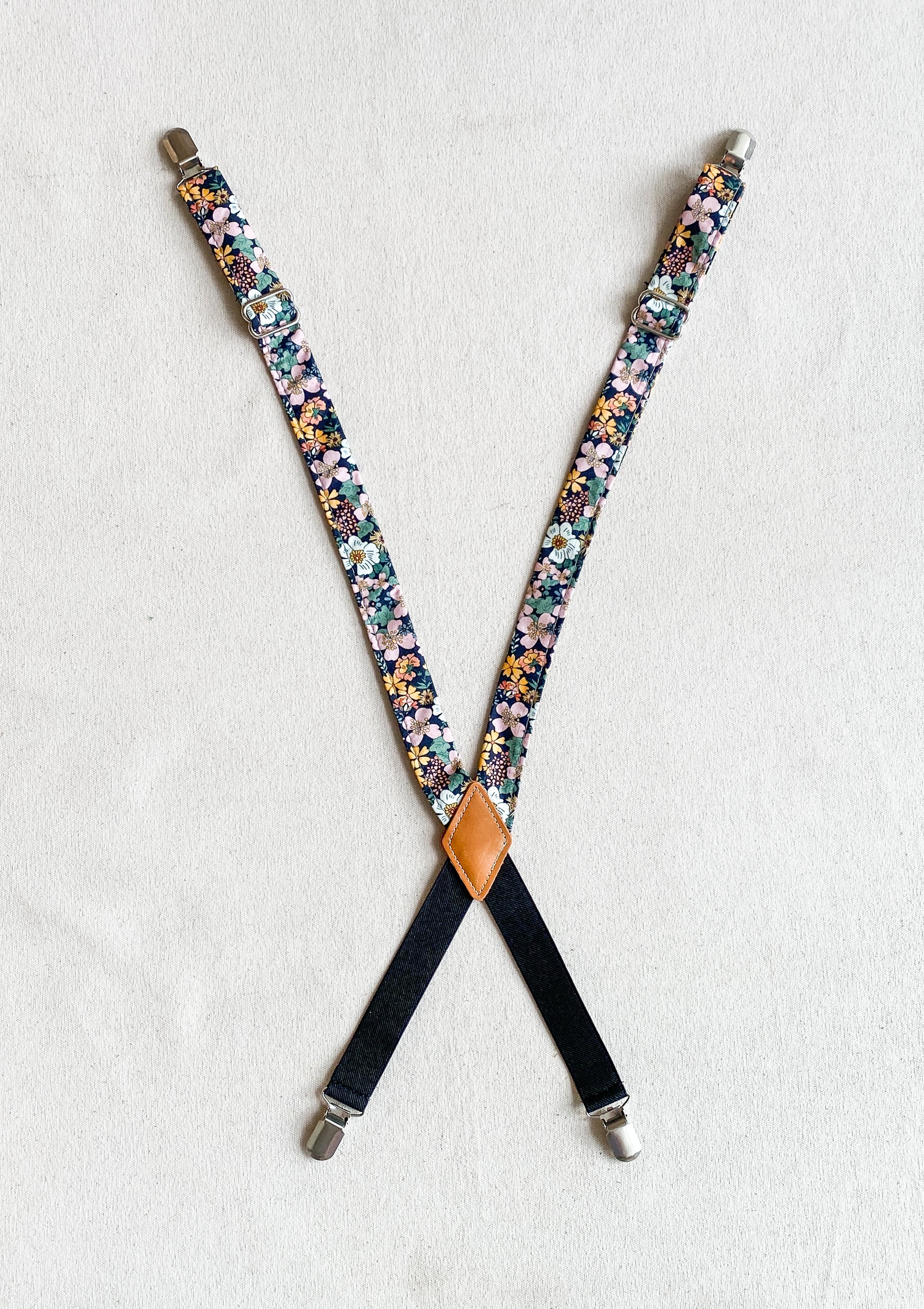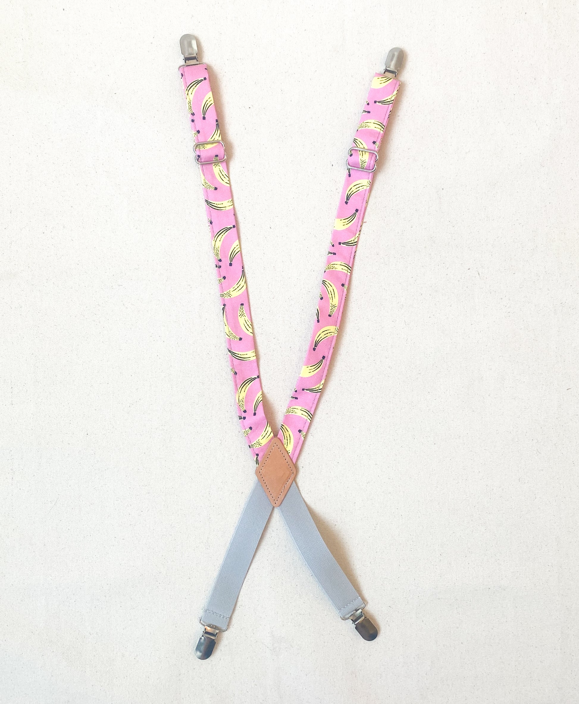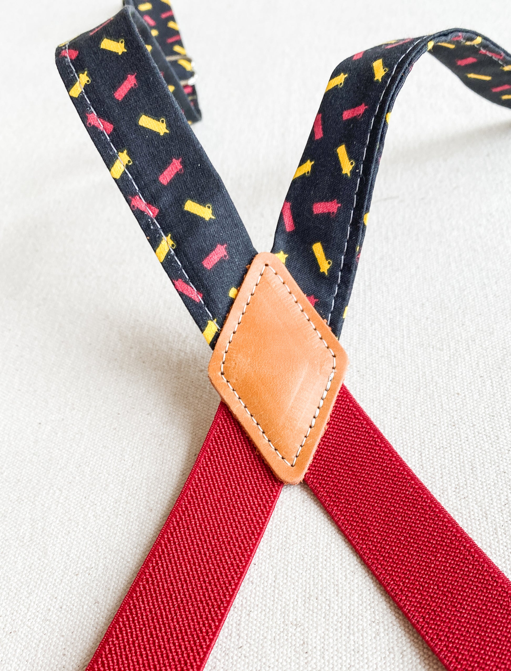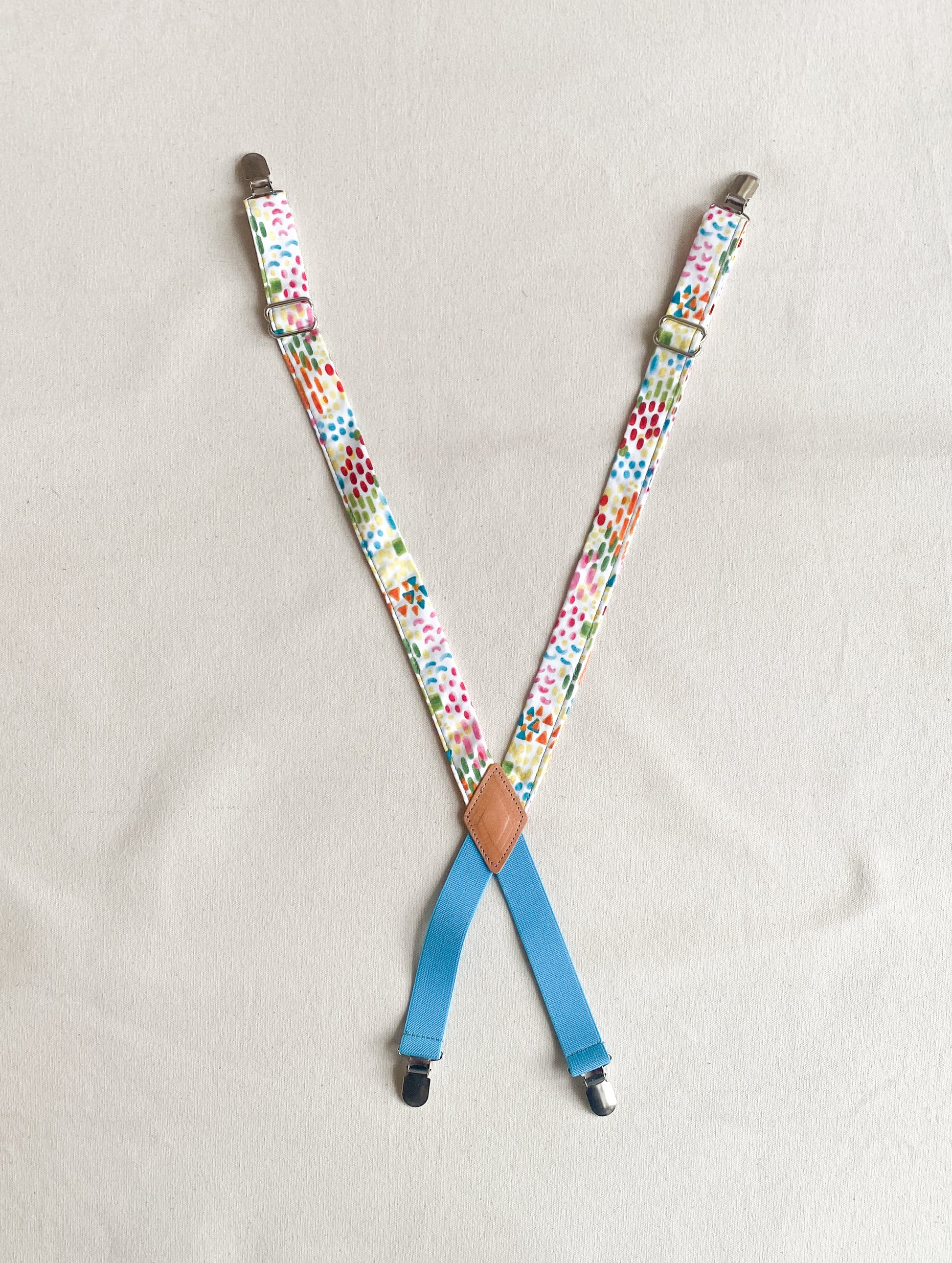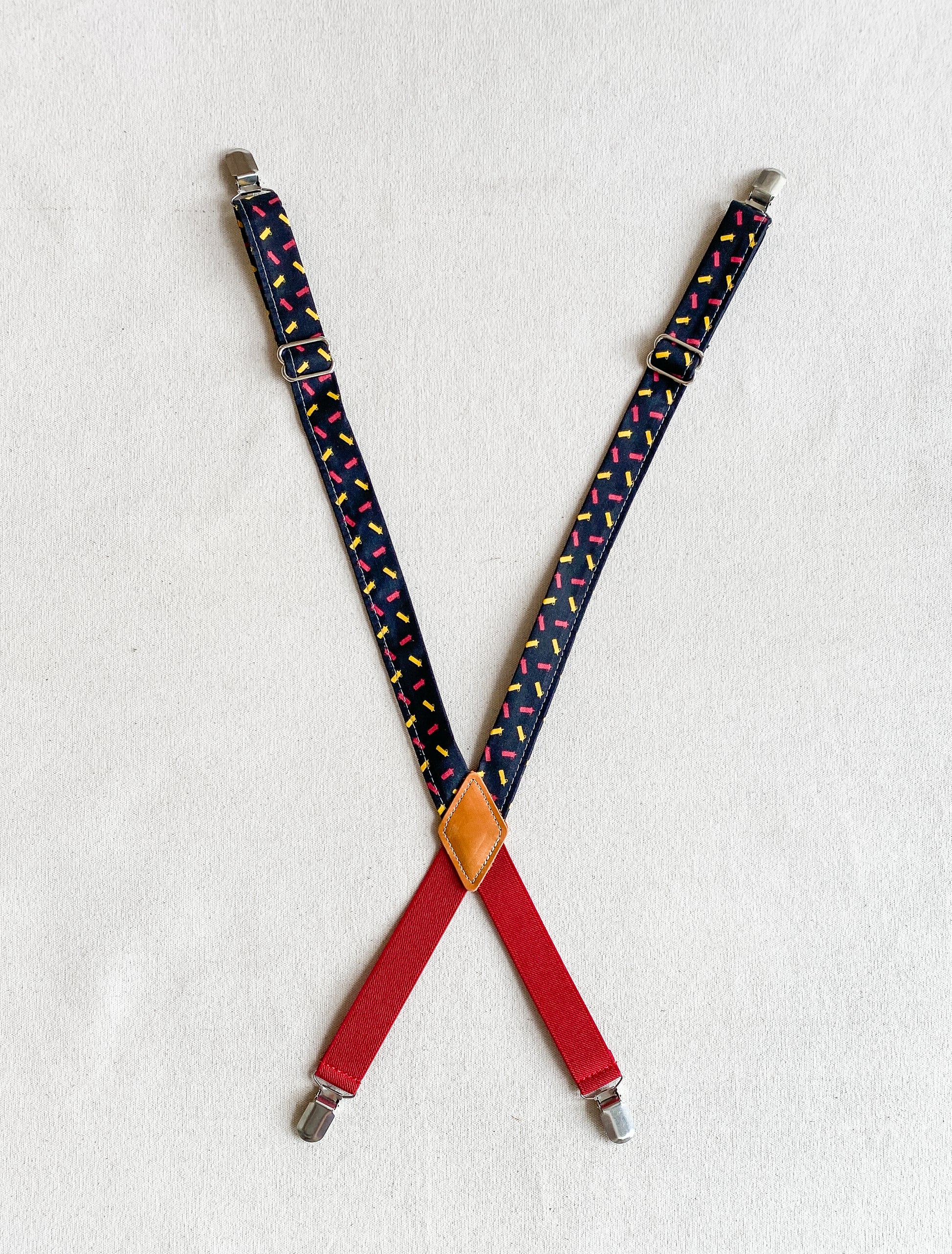 Amp up your Suspender Dress looks with these cute fabric suspenders designed and sewn in-house. Made mostly of non-stretch cotton fabric with a bit of elastic at the back to allow for comfortable movement (and another color opportunity), these will add a little pizazz to your usual Suspender Dress uniform. Finished with silver metal clips and glides for adjustability. Extend to about 28".