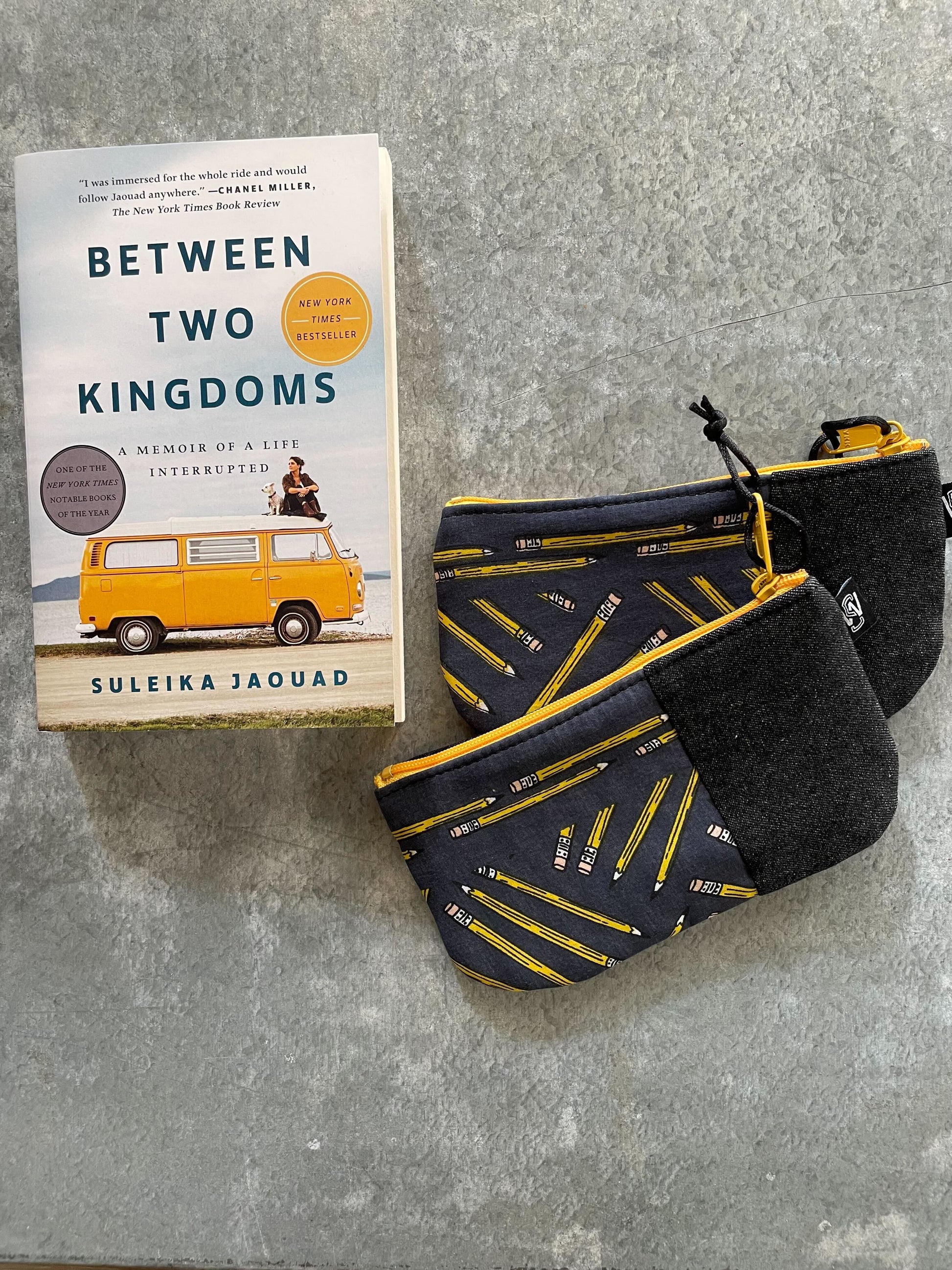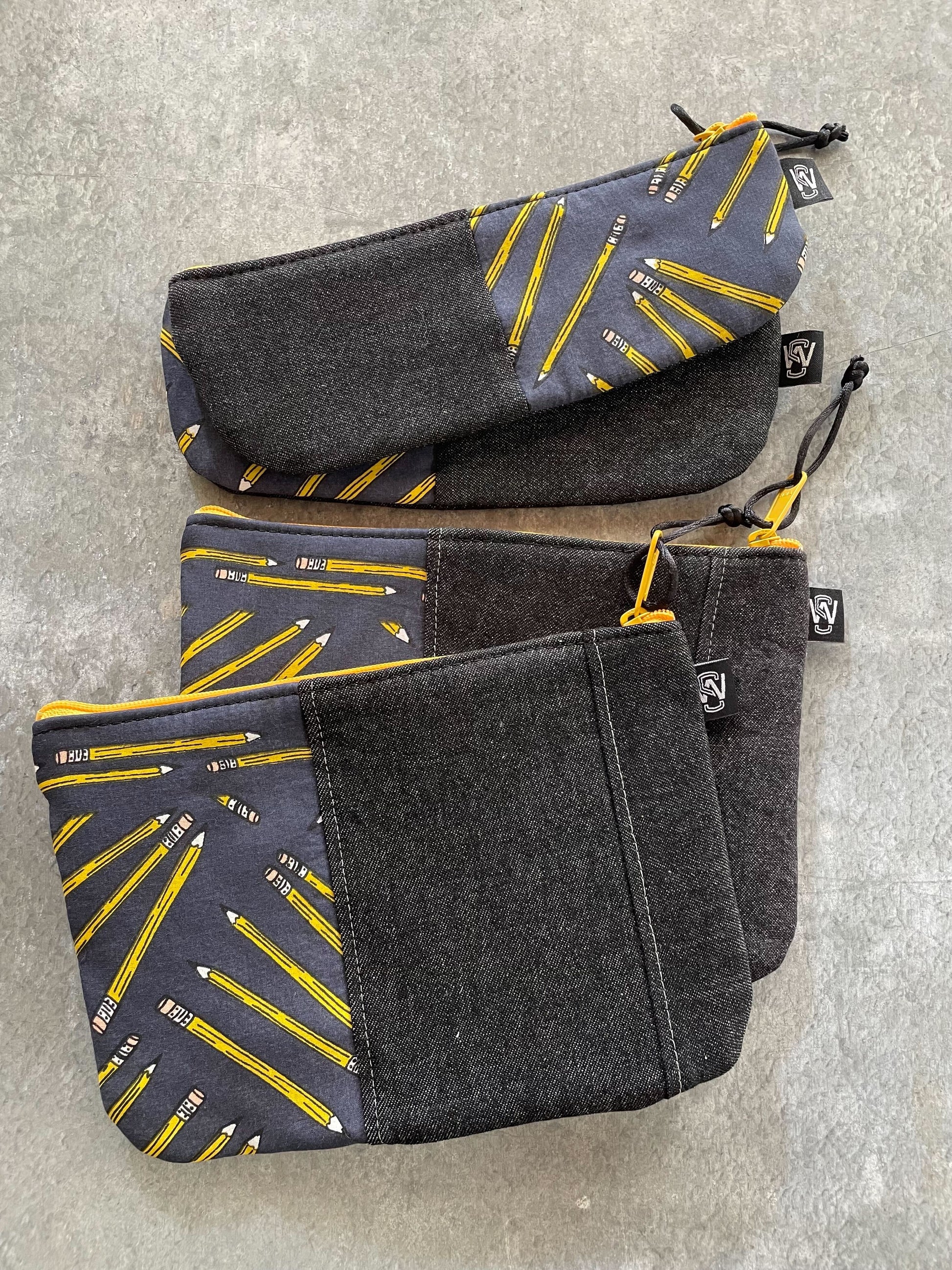 Scrap zipper pouches made from Shift clothing scraps, lined with railroad denim.