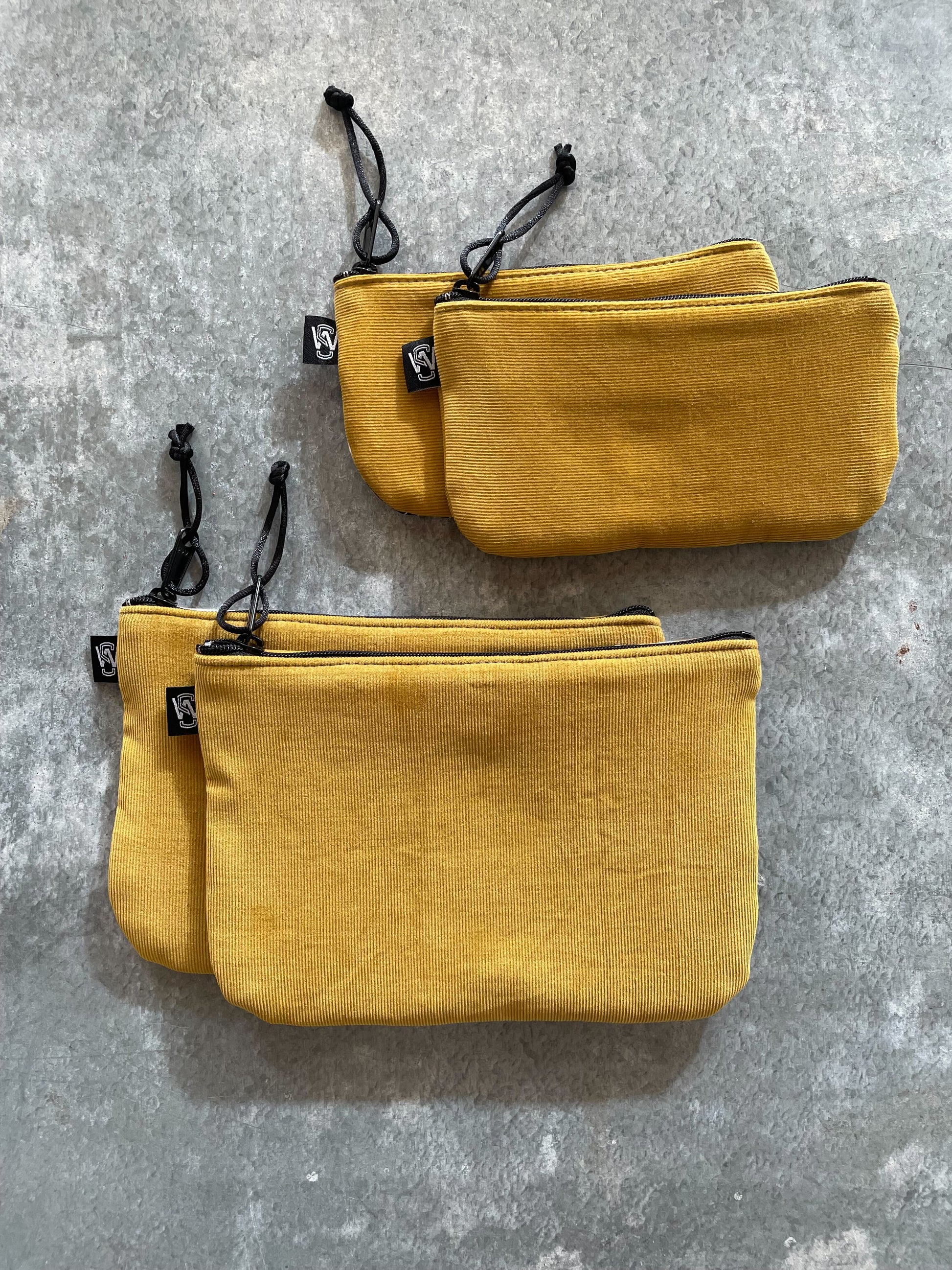 Scrap zipper pouches made from Shift clothing scraps, lined with railroad denim. One side features gold corduroy and a navy floral print, other side is solid gold corduroy.