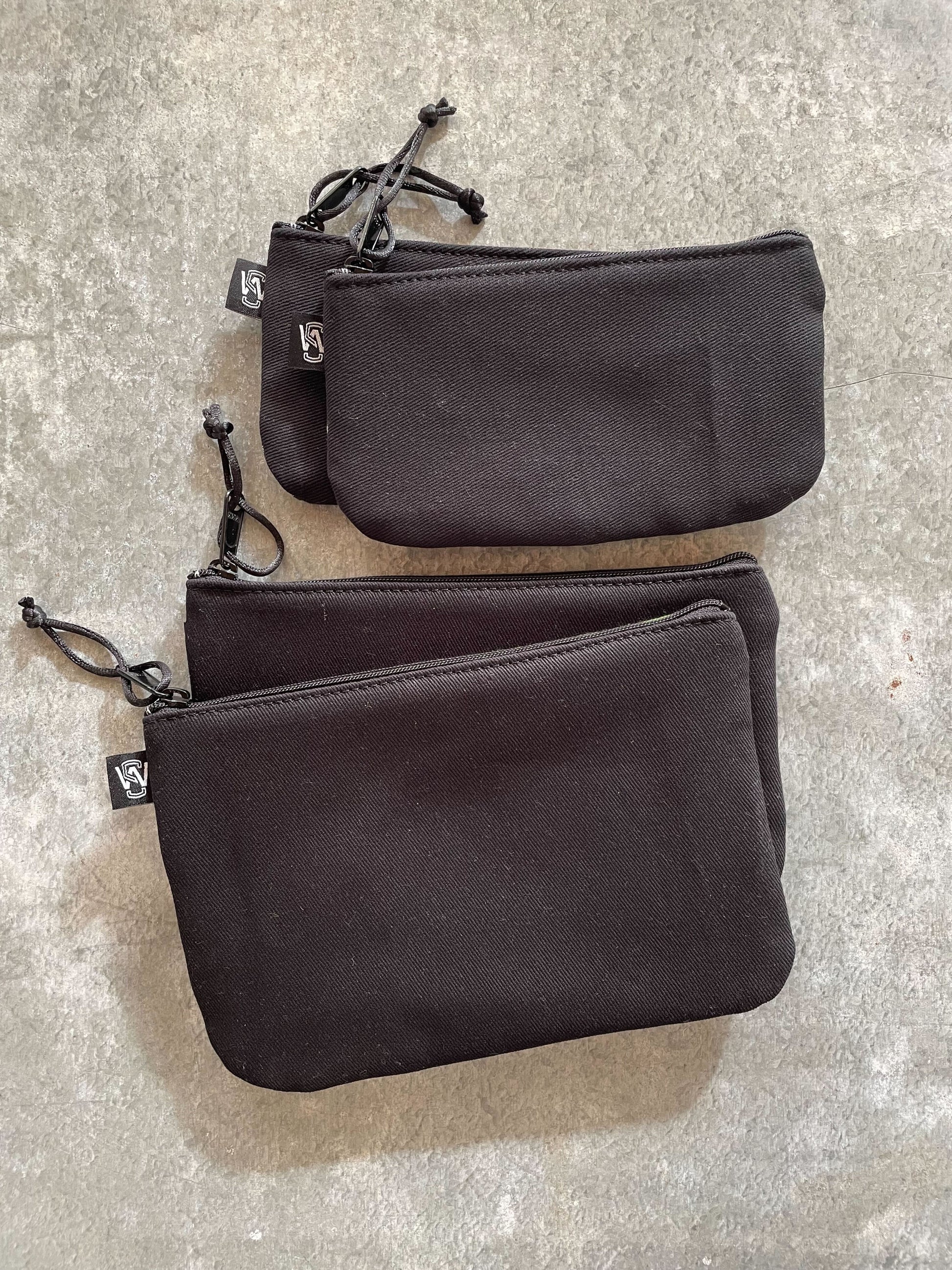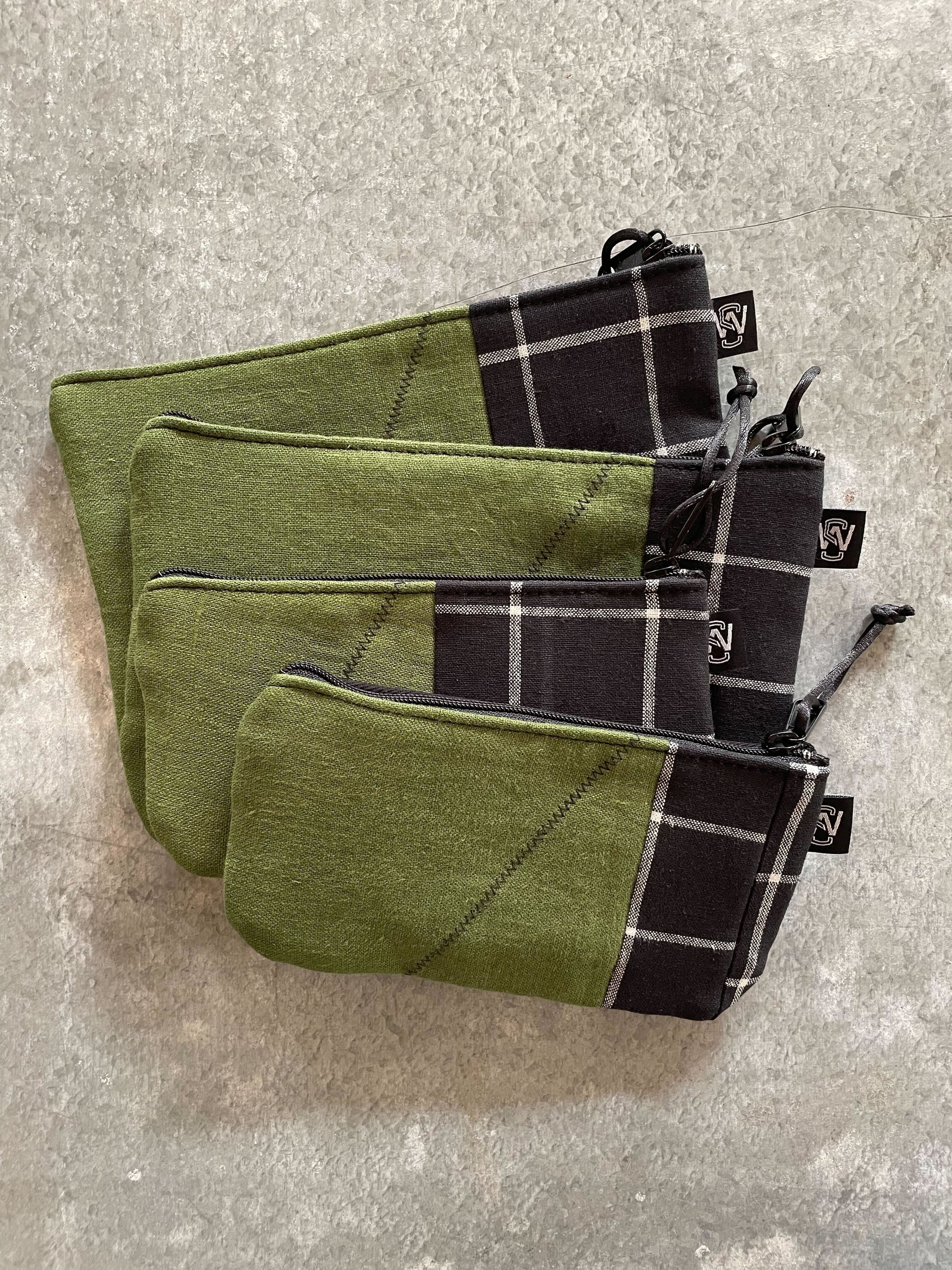 Scrap zipper pouches made from Shift clothing scraps, lined with railroad denim. One side features mossy green linen and black windowpane linen, the other side is solid black cotton twill.