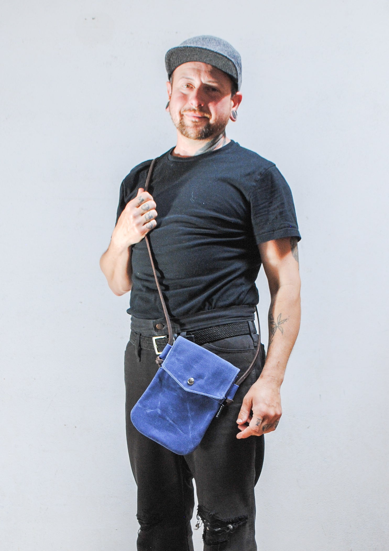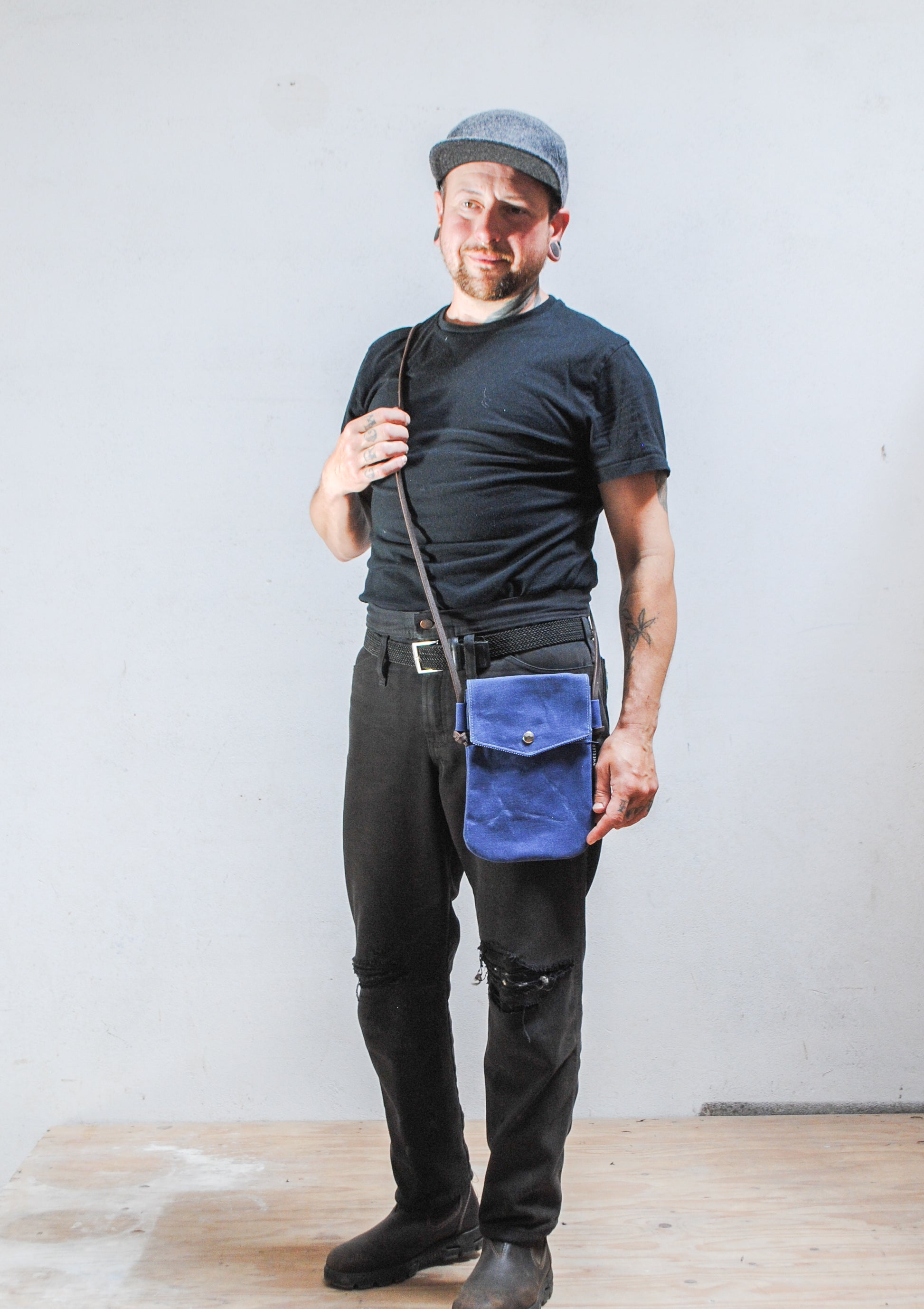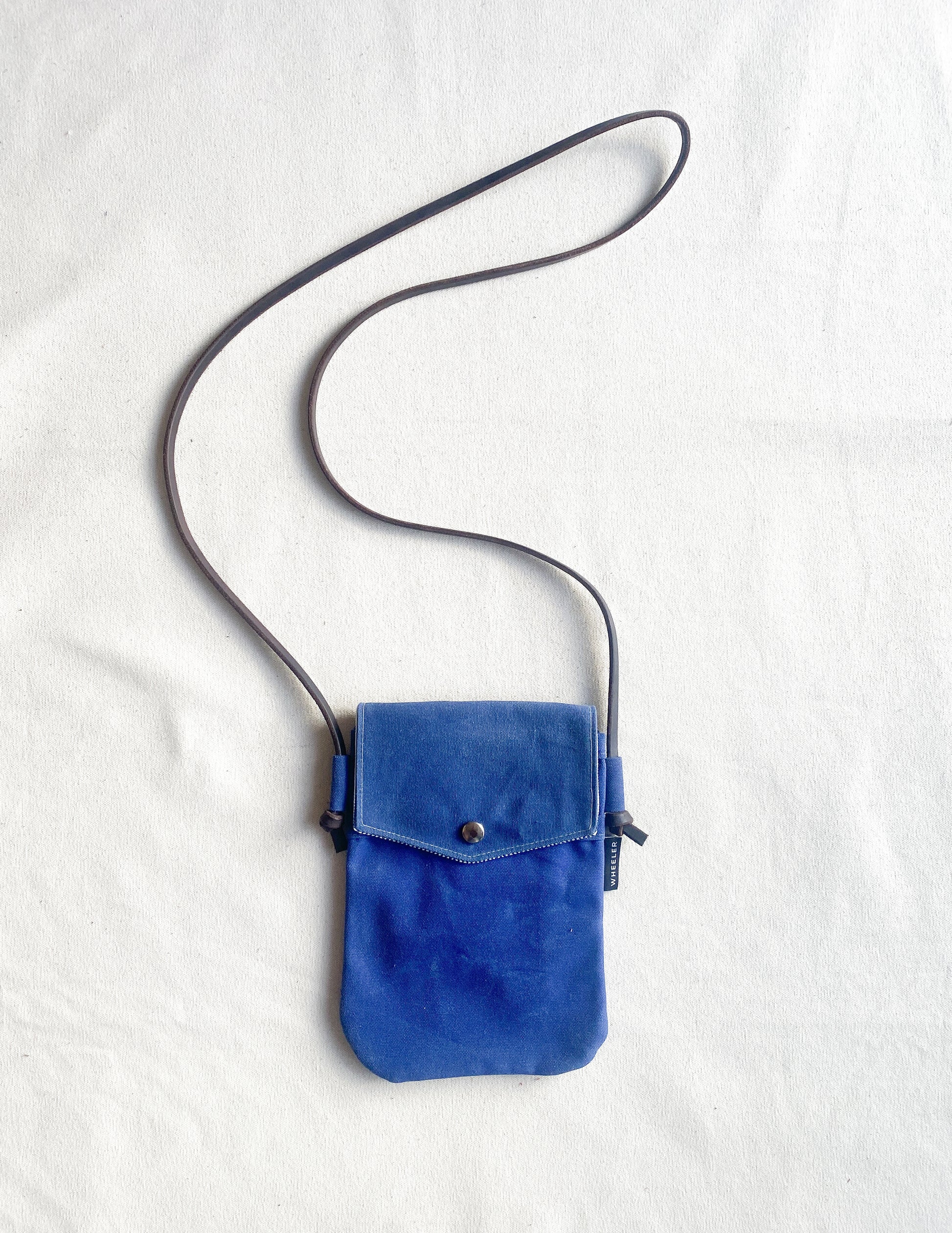 Made with: #10 Waxed Canvas, Railroad denim, Veg-tan Leather, nickel snap.