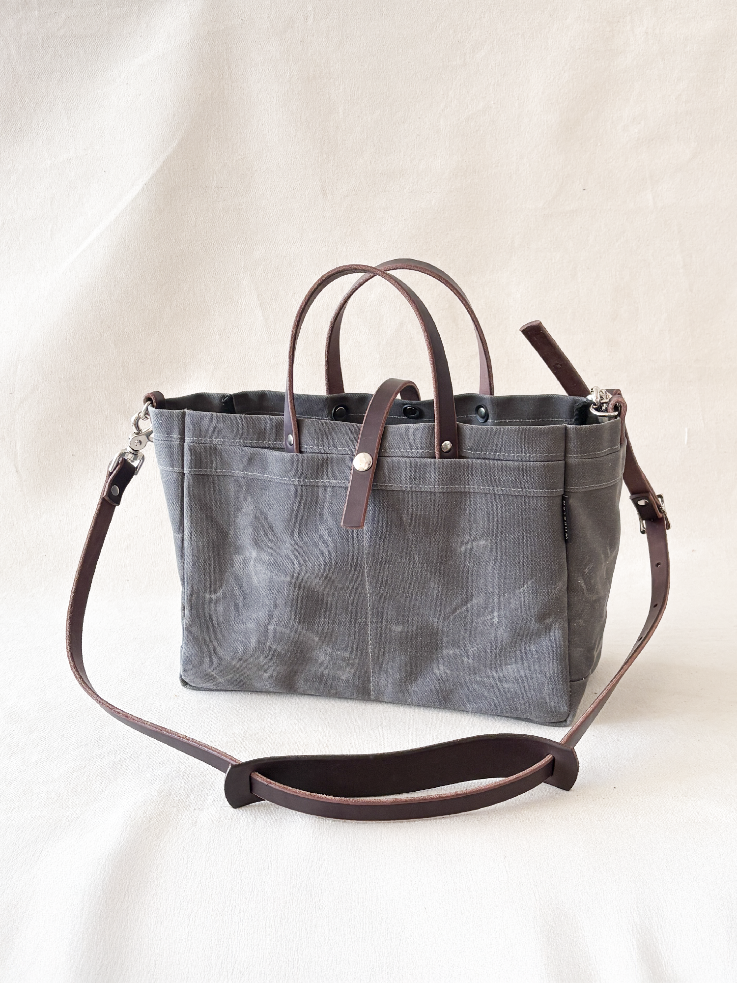 A S+W Classic! This bag is inspired by a classic canvas tool bag, and has served many uses for many customers, including an every day bag! The bottom is a double layer of canvas; handles are attached using leather washers for additional strength. This bag has the most pockets of any Wheeler Bag, with a total of six open-top pockets plus a large main compartment. Comes with adjustable and removable crossbody strap.