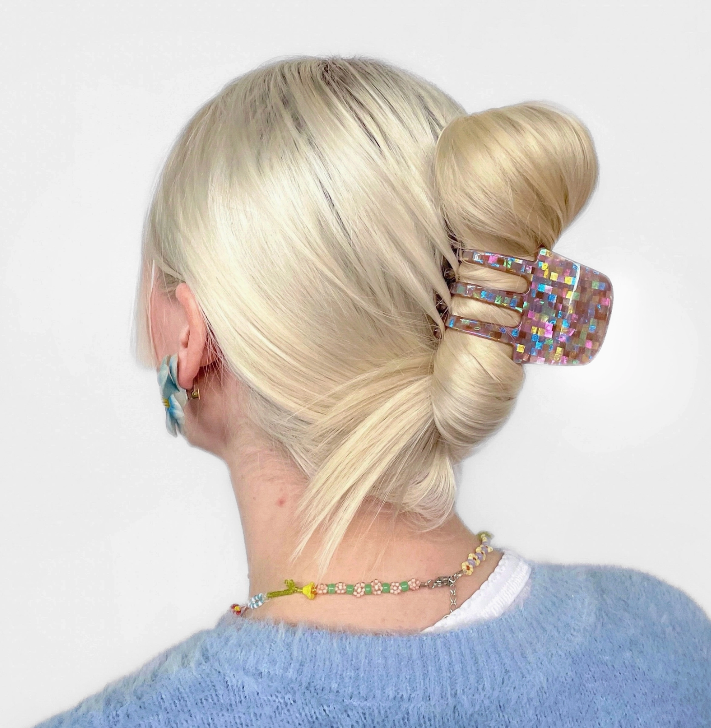 This medium sized claw is uniquely perfect for curly, textured, medium to thick hair. Large teeth give a gentle but firm hold, without crushing curls.